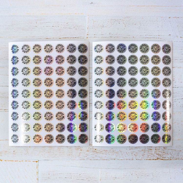 Las hojas de etiquetas vinil holográfico no son las típicas etiquetas personalizas. Presentan un efecto llamativo de arcoíris de colores que cambia según la luz disponible y la perspectiva. Son perfectas para marcar fácilmente tus productos o empaques.